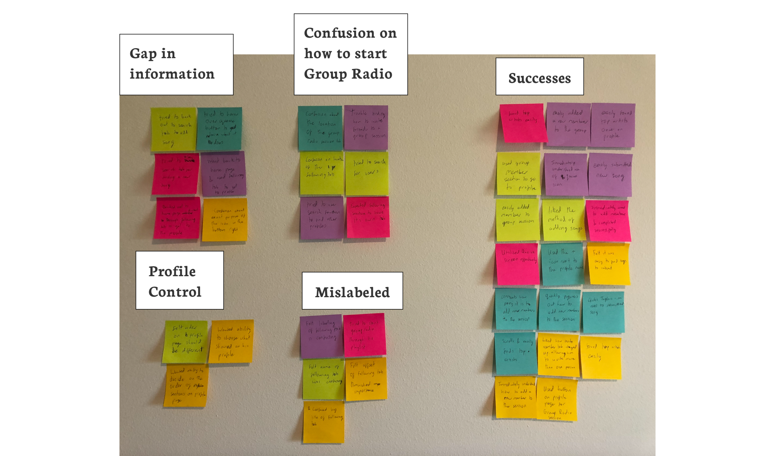 Similar to the research phase, I ended up with a lot of data that I needed to organize into a more actionable format. I decided to do an Affinity map to help organize my findings into patterns. This helped me find problem areas so I could prioritize fixing them.